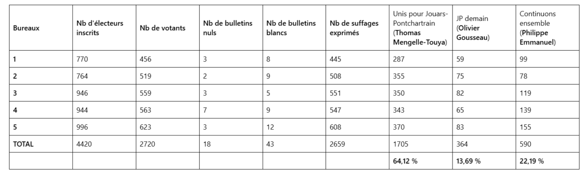 Elections municipales 2026 : résultats du 1er tour Accueil » Actualités » Politique » Elections municipales 2026 : résultats du 1er tour Imprimer la page | Partager la page Découvrez le détail des résultats de la commune de Jouars-Pontchartrain. Il n’y aura donc pas de second tour pour la commune de Jouars-Pontchartrain. Ces sujets peuvent vous intéresser Politique 17.04.2026 Communauté de communes : nouvelle équipe lire la suite Politique 15.03.2026 Elections municipales 2026 : Taux de participation à 20h lire la suite Politique 15.03.2026 Elections municipales 2026 : Taux de participation à 18h lire la suite Politique 05.03.2026 Élections municipales – 1er tour le 15 mars lire la suite