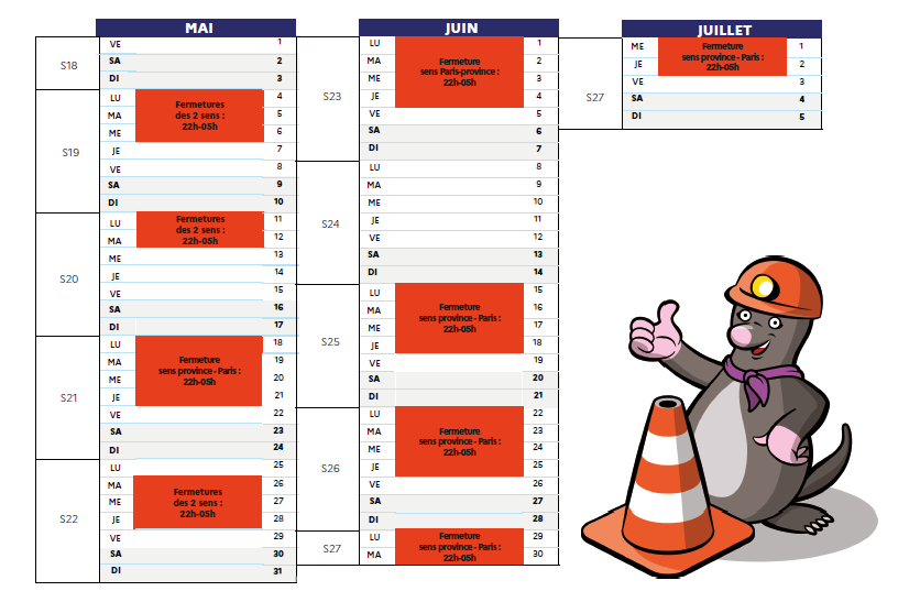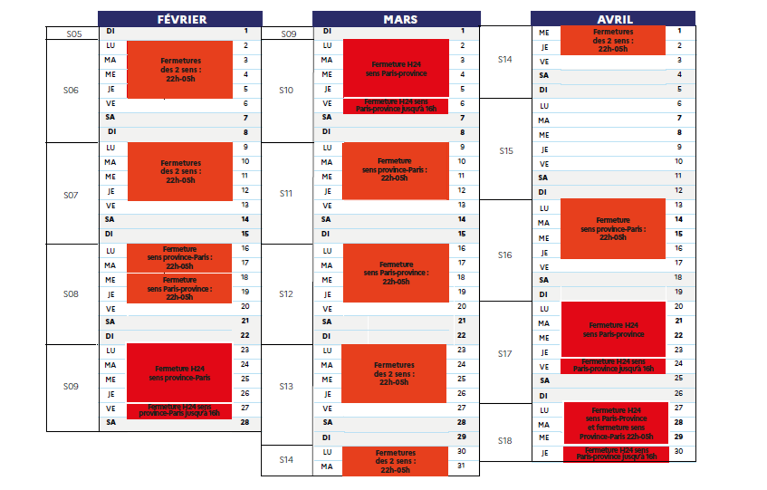 Retrouvez ci-dessous l’ensemble du calendrier prévisionnel de fermeture du tunnel avec les détails sur les périodes de fermetures dites « prolongées », c’est-à -dire au delà du créneau initial de 22h-5H du matin.